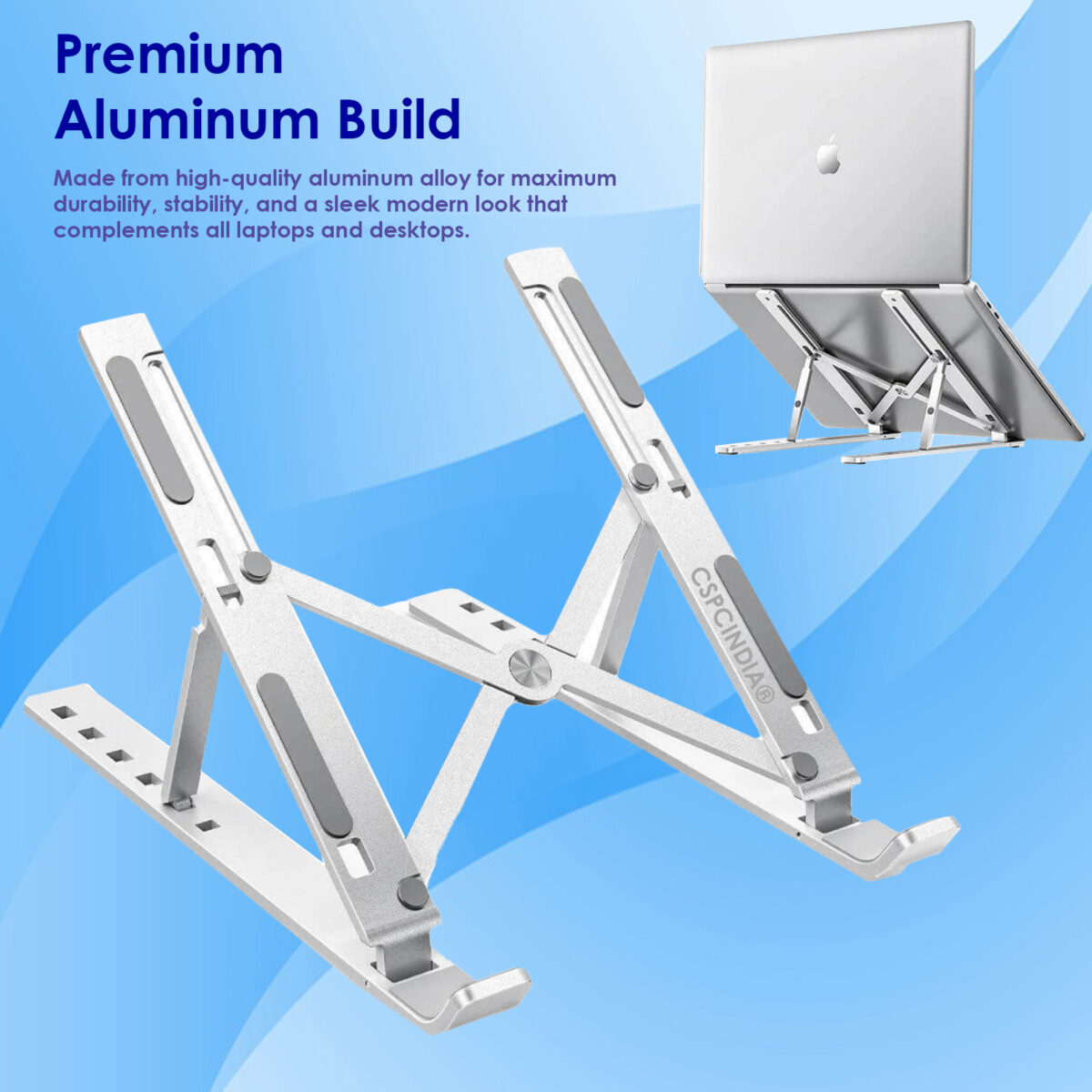 Elevate your productivity and comfort with the CSPC INDIA Adjustable Laptop Stand – a sleek, durable, and highly functional companion for your work or study setup. Crafted from premium-grade aluminum, this stand offers 6 customizable angles to help you maintain a healthy posture, reduce neck strain, and enhance ventilation for your device.